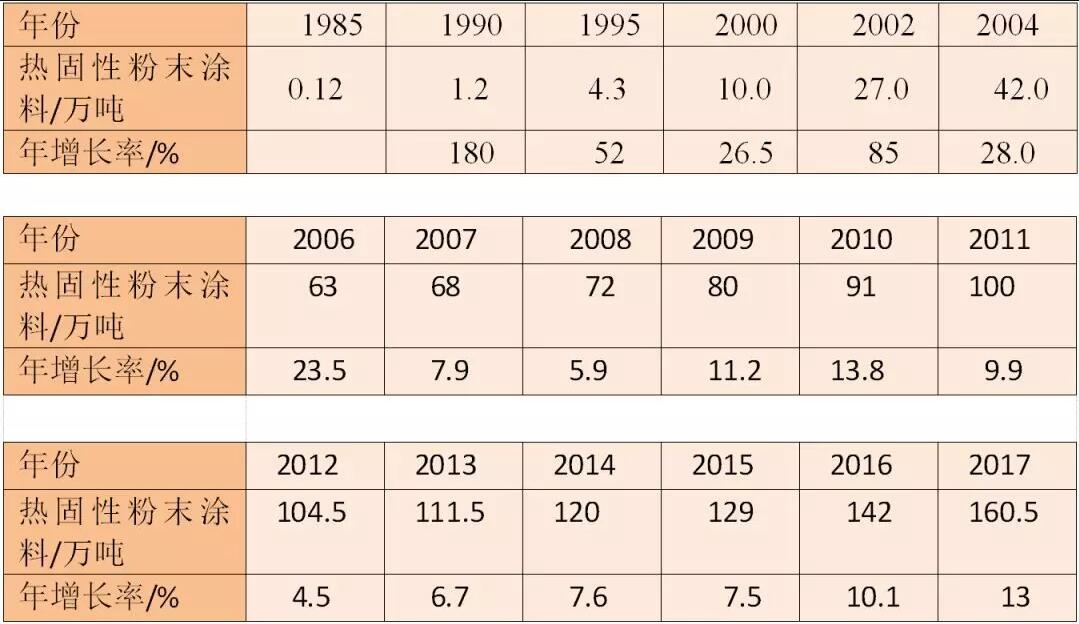 1985年~2017年我国热固性粉末涂料销售量及年增长率(来源:涂料工业)